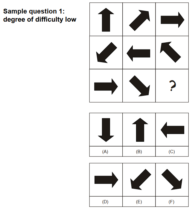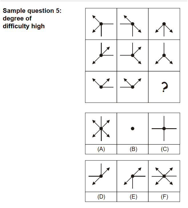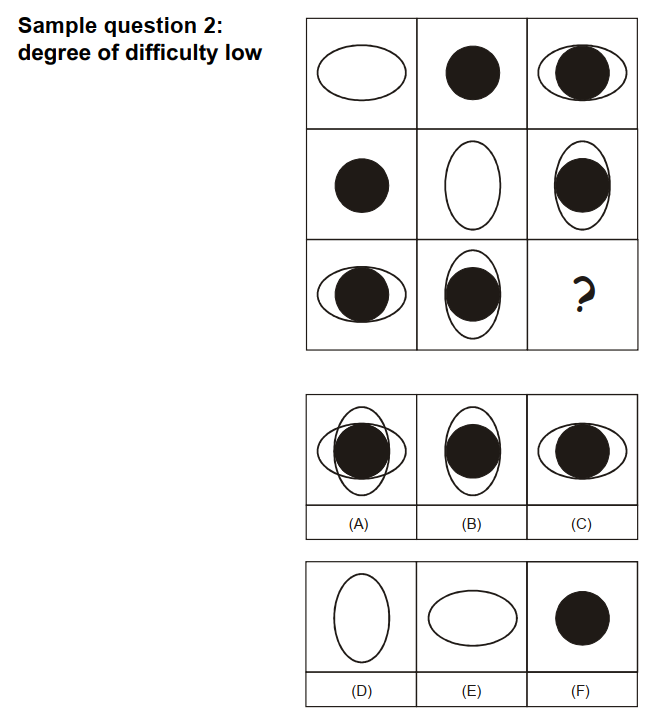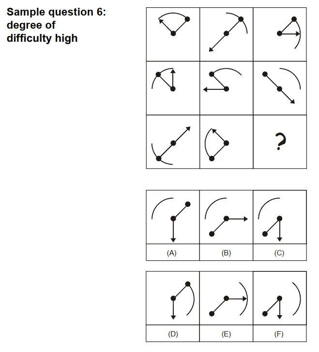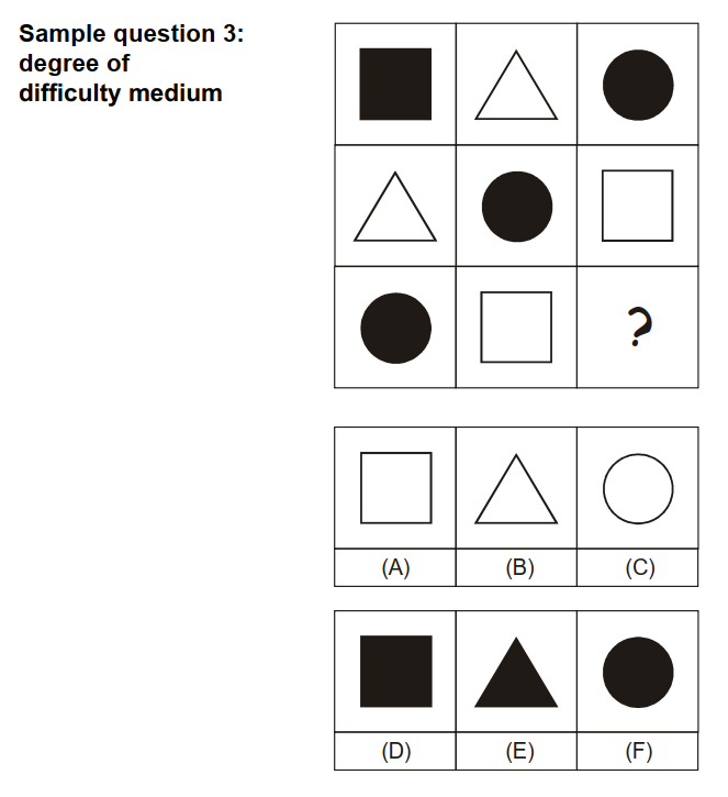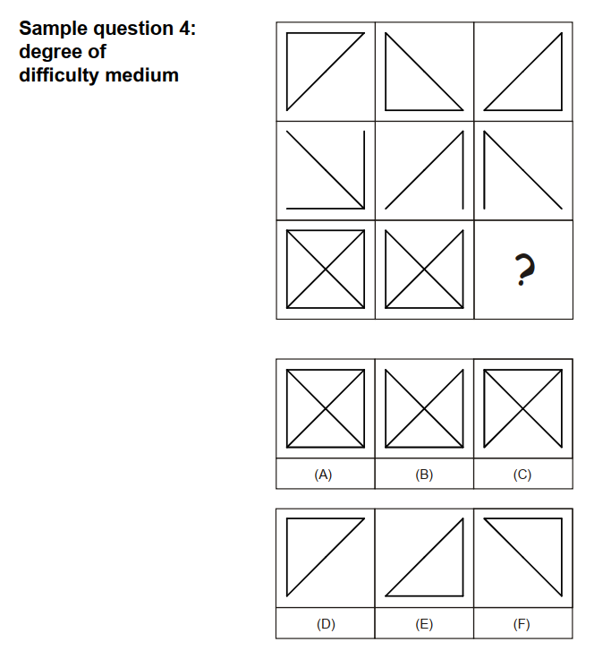 In the subtest “Completing Patterns”, lines, circles, quadrilaterals and other geometrical shapes are arranged in the fields of a matrix according to a specific rule.